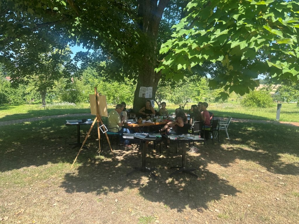 Nach einer kurzen Einführung tauschten die Teilnehmenden ihre Lieblingsmotive vom Landleben aus: ob alte Fachwerkhäuser, weite Wiesen, Tiere oder Feldwege – die Vielfalt der Anregungen spiegelte die besondere Atmosphäre des Dorfes wider. Schon bald wurde eifrig skizziert, ausprobiert und diskutiert. Wer mochte, ergänzte seine Zeichnungen mit Farbe, sodass kleine individuelle Kunstwerke entstanden.