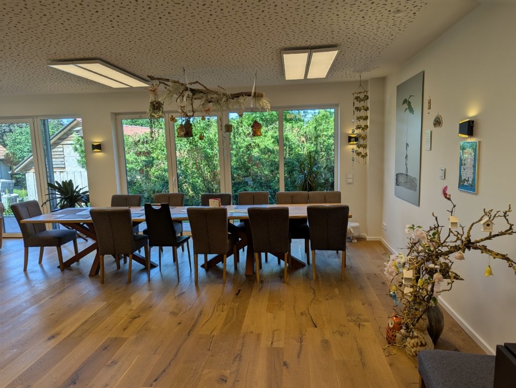 Rund um die Wohnungen lädt ein großzügiger, biologisch wertvoll angelegter Park zum Spazieren, Verweilen und Begegnen ein. Ein speziell für Seniorinnen und Senioren konzipierter Aktivitätsparcours fördert Gleichgewicht, Mobilität und Sicherheit, der hauseigene Fitnessraum unterstützt ein gesundes Maß an Bewegung, und vielfältige Gemeinschaftsräume schaffen Raum für Austausch, Kurse und gemütliche Zusammenkünfte. Für größere Anlässe steht zudem ein großer Saal zur Verfügung, in dem Familienfeiern, Vorträge, Vereinstermine und gesellige Veranstaltungen bleibend Erinnerungen schaffen.
